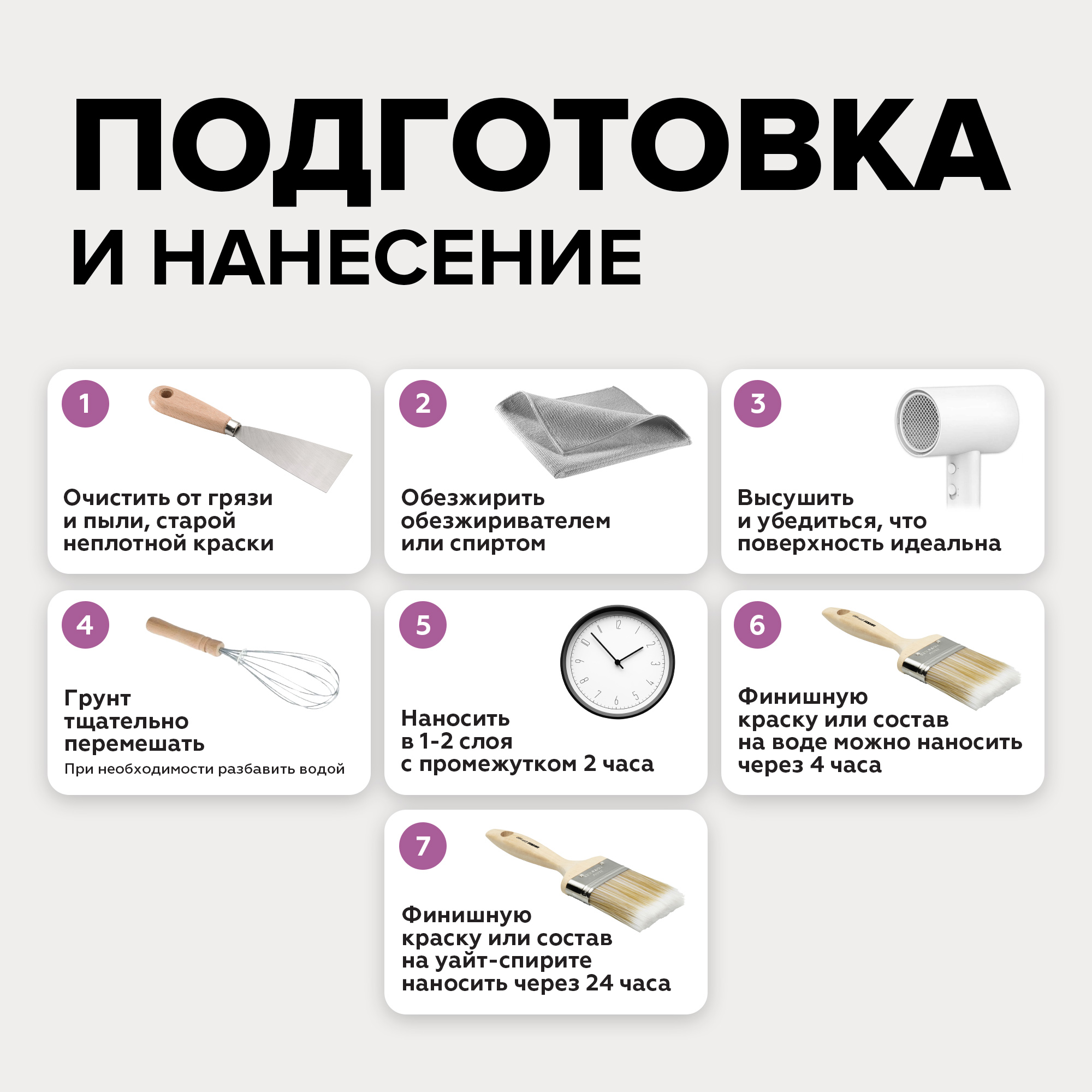Рекомендуется нанесение в 1-2 (в зависимости от впитывающей способности поверхности) слоя до получения ровной адгезионной поверхности. В случае нанесения на глянцевые, сложные поверхности избегать избыточной толщины нанесения. Избегать потеков, наслоений, излишней толщины слоев.