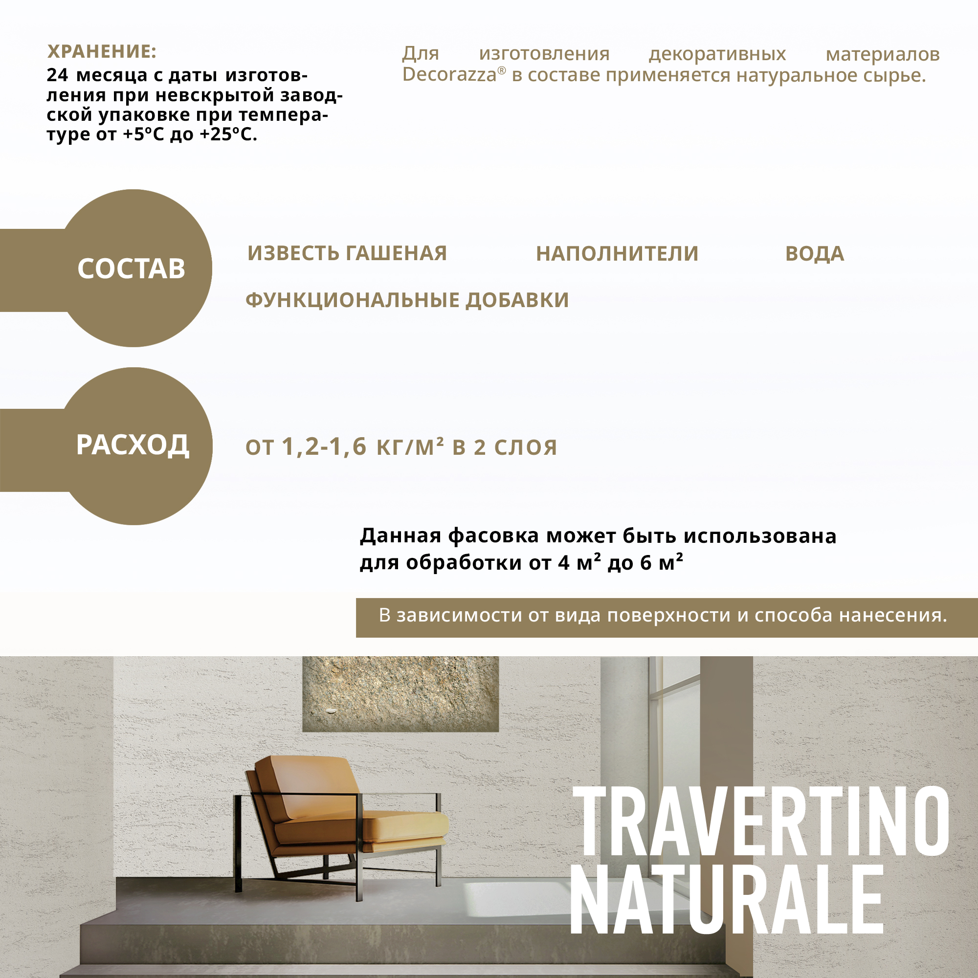 Купите у нас: Декоративное покрытие Travertino naturale - Известковый материал Travertino Naturale предназначен для отделки стен и потолков внутри помещений для создания паропроницаемого экологичного покрытия, устойчивого к истиранию и защищающего поверхность от появления грибка и плесени. от завода: Decorazza!