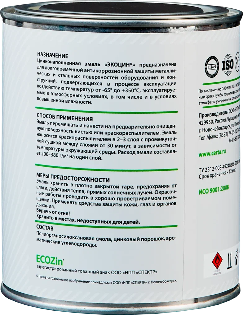 Купите у нас: Эмаль цинконаполненная Экоцин - Быстросохнущий цинконаполненный грунт для долговременной антикоррозийной защиты металлических изделий от завода: Церта!