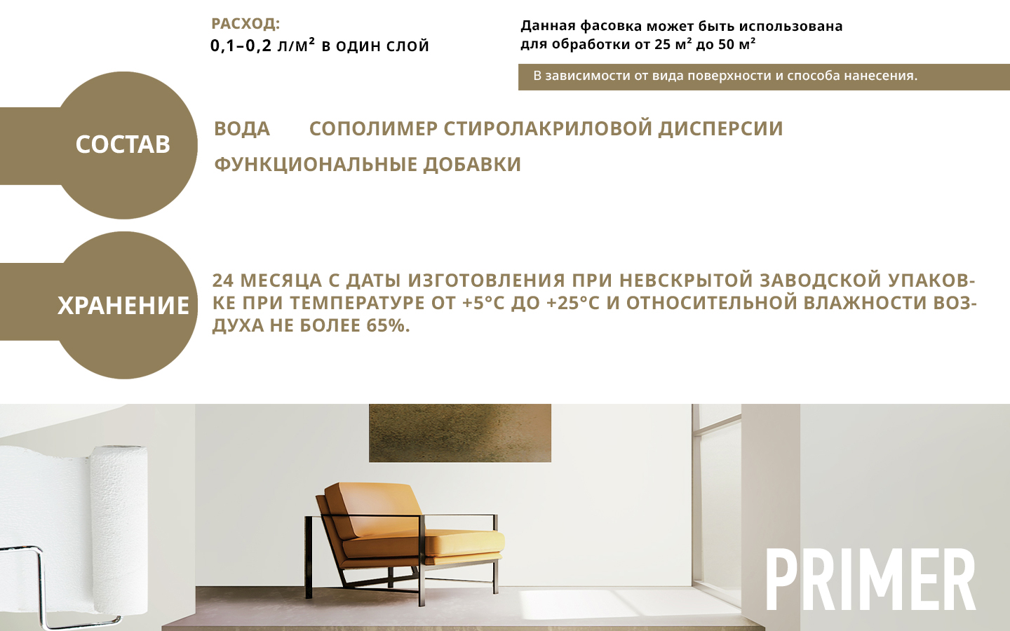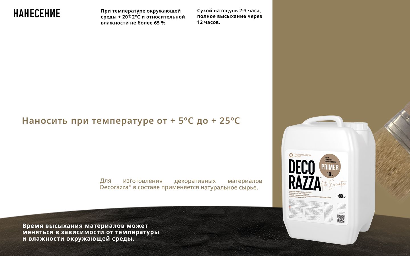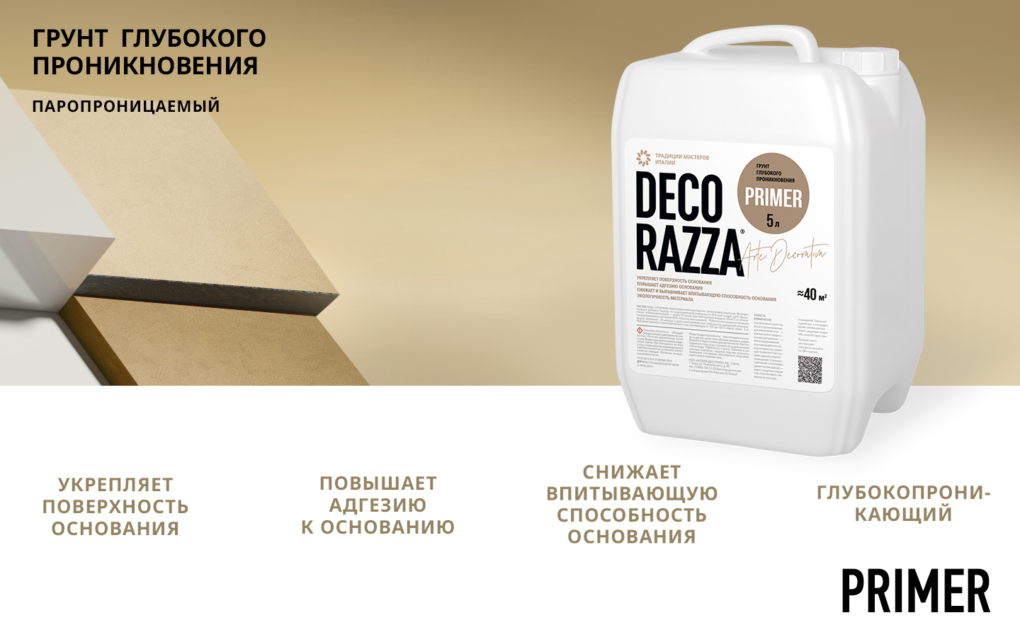 Купите у нас: Грунт глубокого проникновения PRIMER - Грунт Decorazza PRIMER — это высококачественная акриловая грунтовка, специально разработанное для минеральных поверхностей, таких как бетон, кирпич и штукатурка. Его особенность заключается в глубоком проникновении, что обеспечивает надежную основу для последующих отделочных работ. Благодаря своей формуле, Decorazza PRIMER обладает укрепляющими свойствами, повышая прочность и долговечность поверхностного слоя. Этот грунт не содержит вредных веществ и абсолютно без запаха, что делает его безопасным для использования в жилых и офисных помещениях. Decorazza PRIMER идеально подходит для подготовки поверхностей перед нанесением красок или декоративных покрытий, обеспечивая их лучшее сцепление и равномерное покрытие. от завода: Decorazza!