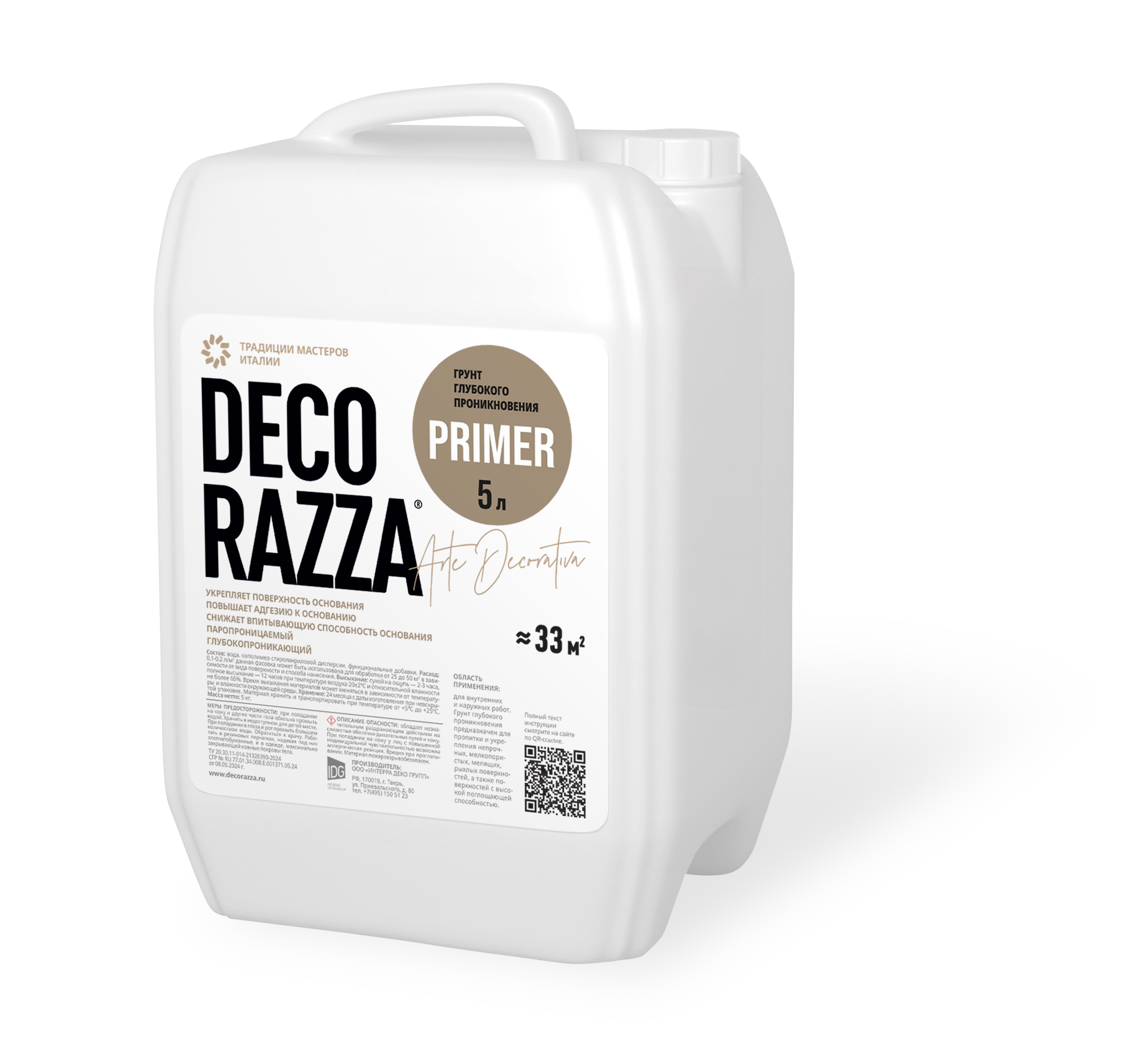Купите у нас: Грунт глубокого проникновения PRIMER - Грунт Decorazza PRIMER — это высококачественная акриловая грунтовка, специально разработанная для минеральных поверхностей, таких как бетон, кирпич и штукатурка. Этот грунт обладает уникальной способностью глубокого проникновения, обеспечивая надежное сцепление с основанием и значительно повышая адгезию декоративной краски или покрытия. Decorazza PRIMER отличается от других грунтов отсутствием неприятного запаха, что делает его идеальным выбором для помещений, где важна комфортная атмосфера. Его укрепляющие свойства обеспечивают долговечность и прочность отделки, делая поверхность устойчивой к механическим воздействиям и погодным условиям. Этот грунт идеально подходит для подготовки основания перед нанесением декоративных покрытий, обеспечивая безупречную гладкость и однородность цвета. Decorazza PRIMER гарантирует качественную основу для любых декоративных работ, делая их долговечными и эстетичными. от завода: Decorazza!