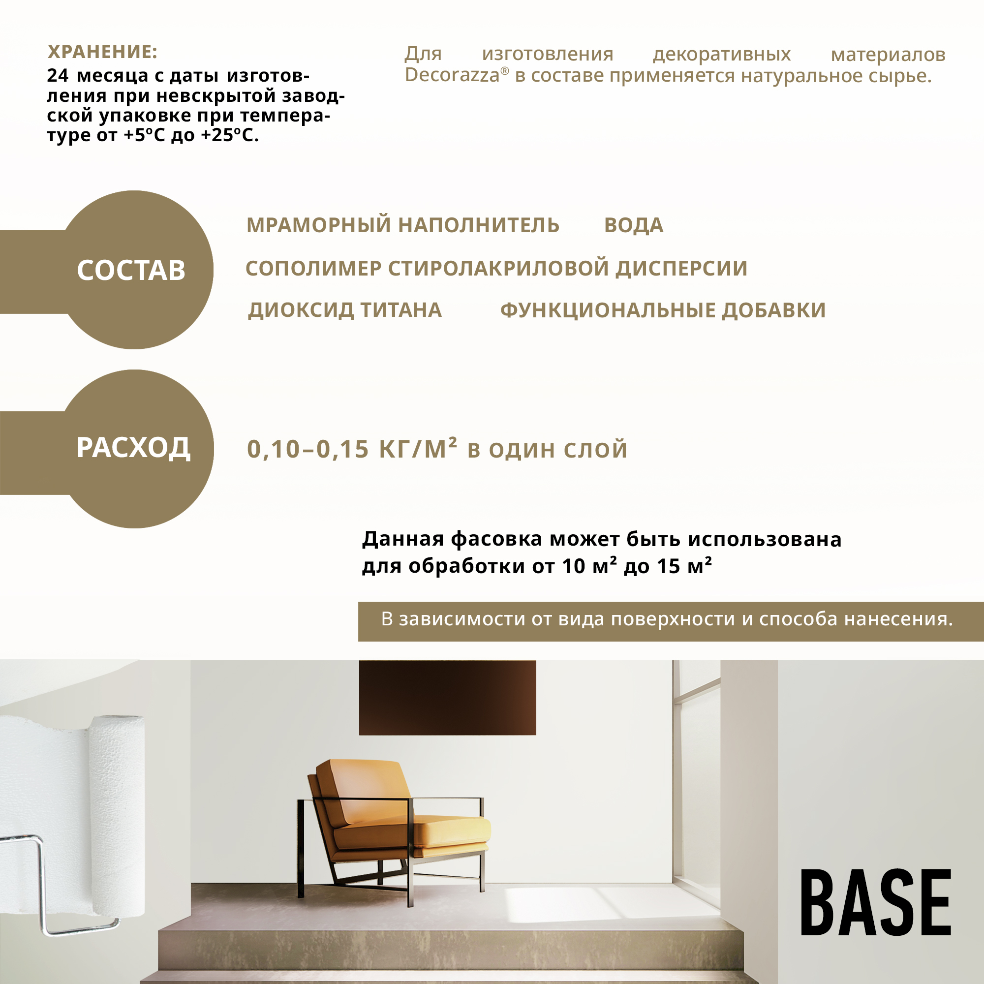 Для внутренних работ. Грунт-краска Base применяется для цветового выравнивания поверхности под финишное нанесение, а также для улучшения адгезии поверхности с последующими финишными слоями декоративных материалов ТМ Decorazza.