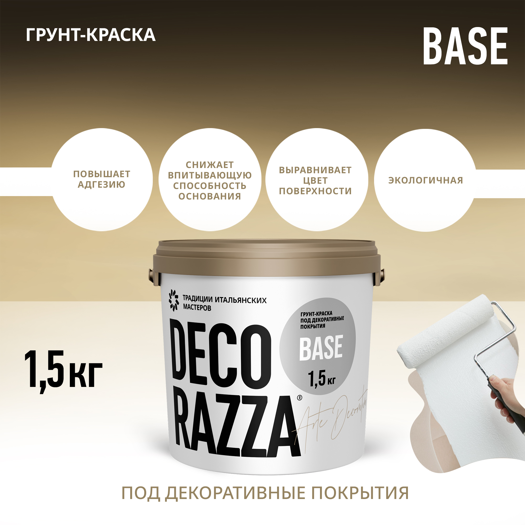 Купите у нас: Грунт-краска BASE - Грунт-краска Decorazza BASE представляет собой высококачественную акриловую основу, специально разработанную для создания эффектных декоративных покрытий и штукатурок. Благодаря своей безароматной формуле, этот продукт идеально подходит для работы как внутри помещений, так и снаружи, обеспечивая комфортное пространство без неприятного запаха. Decorazza BASE обеспечивает отличное сцепление с различными поверхностями, обеспечивая долговечность и устойчивость декоративной отделки к внешним воздействиям. Эта грунт-краска является незаменимым инструментом для дизайнеров и художников, стремящихся к изысканному и неповторимому дизайну интерьера или экстерьера. от завода: Decorazza!