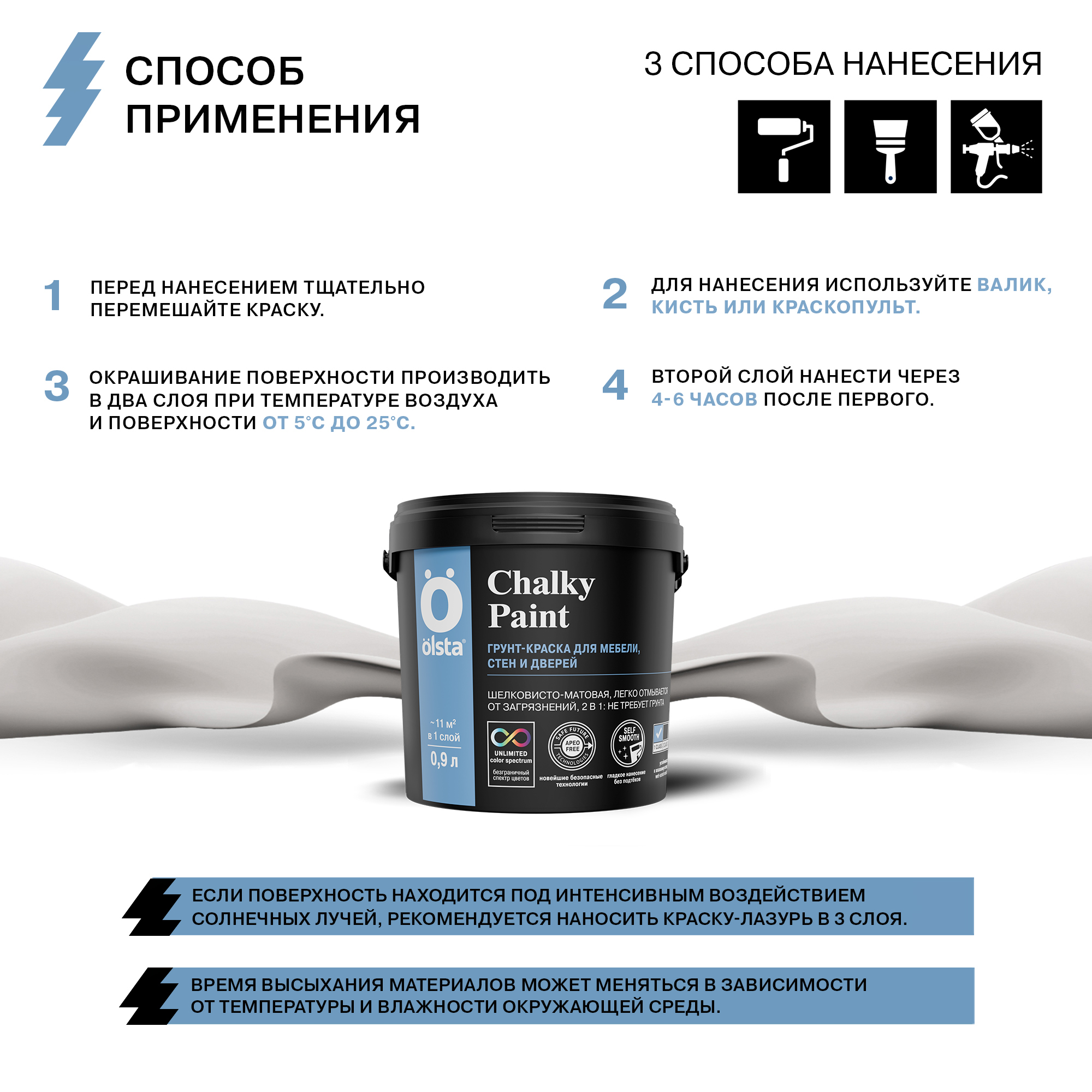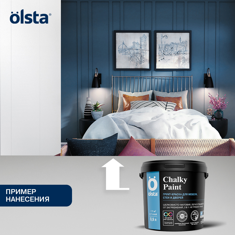 Купите у нас: Краска для мебели меловая CHALKY PAINT - Краска для мебели меловая OLSTA CHALKY PAINT — это непревзойденное решение для тех, кто мечтает о стильной и долговечной мебели без лишних хлопот. Эта мебельная краска обладает уникальной матовой текстурой, напоминающей натуральный мел, что придает поверхности уютный и элегантный вид. Экологичная формула на водной основе гарантирует отсутствие неприятного запаха, делая процесс окрашивания комфортным как для вас, так и для вашего дома. OLSTA CHALKY PAINT отличается своей стойкостью к износу, обеспечивая долгие годы безупречного вида вашей мебели. Благодаря возможности колерования, вы можете подобрать идеальный оттенок под любой интерьер, создавая неповторимую атмосферу в каждом уголке вашего пространства. Используйте эту краску для обновления старых вещей или придания оригинальности новым предметам мебели, наслаждаясь безопасностью и качеством продукта, который отвечает всем современным требованиям экологии и дизайна. от завода: OLSTA!
