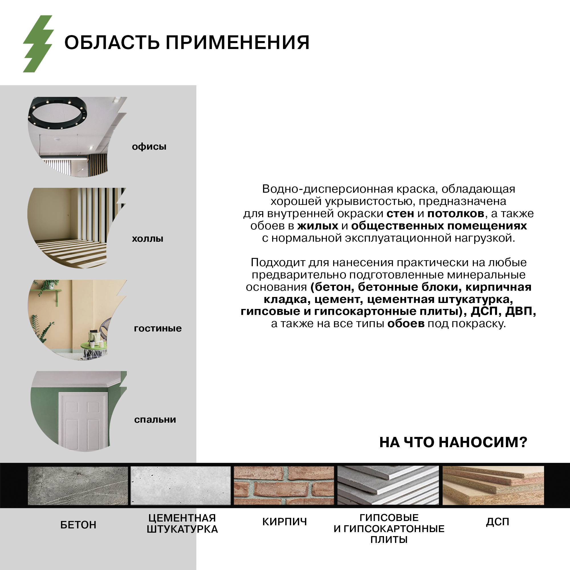Подходит для нанесения практически на любые предварительно подготовленные минеральные основания (бетон, бетонные блоки, кирпичная кладка, цемент, цементная штукатурка, гипсовые и гипсокартонные плиты), ДСП, ДВП, а также на все типы обоев под покраску.