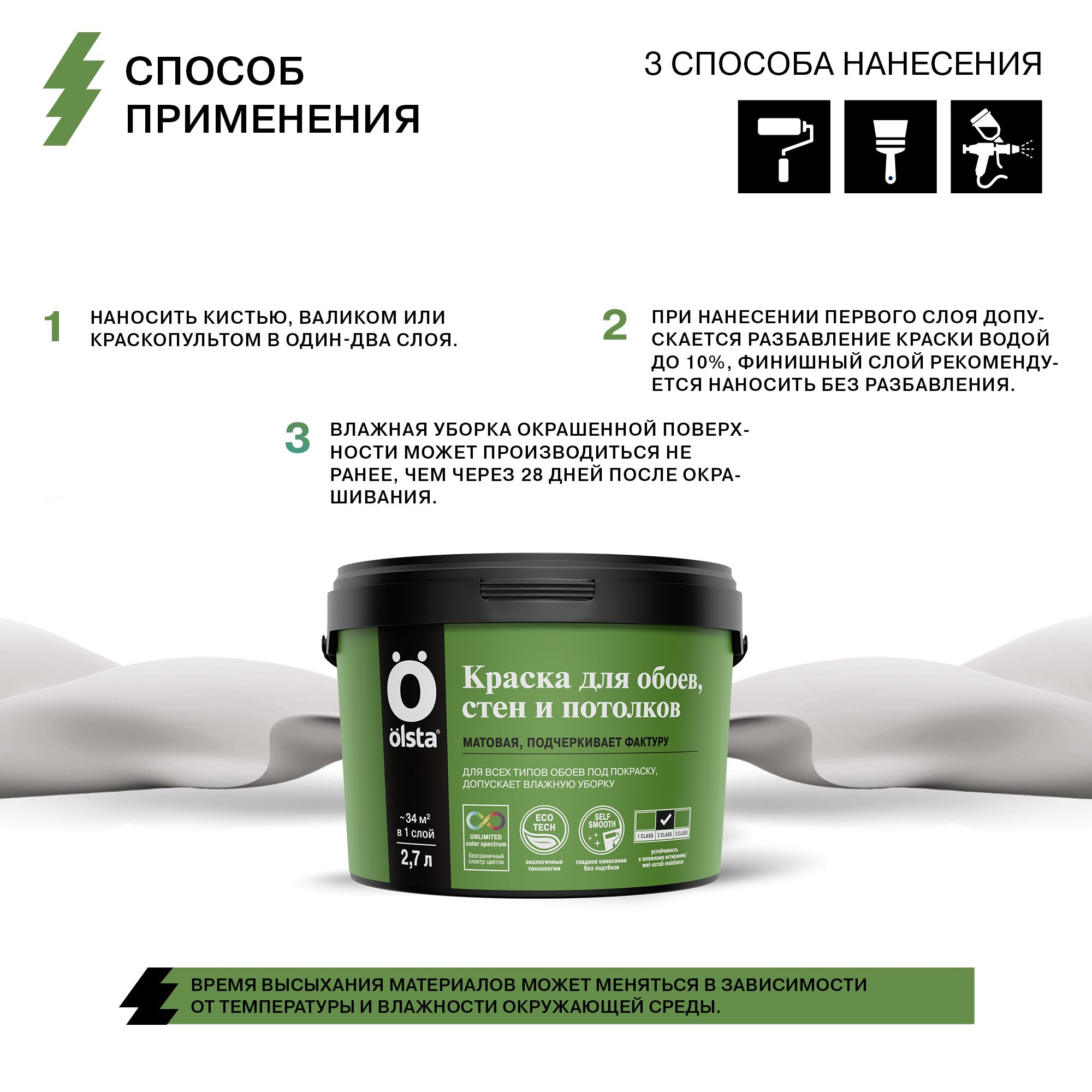 Наносить кистью, валиком или краскопультом в один-два слоя. При нанесении первого слоя допускается разбавление краски водой до 10%, финишный слой рекомендуется наносить без разбавления. Влажная уборка окрашенной поверхности может производиться не ранее, чем через 28 дней после окрашивания.