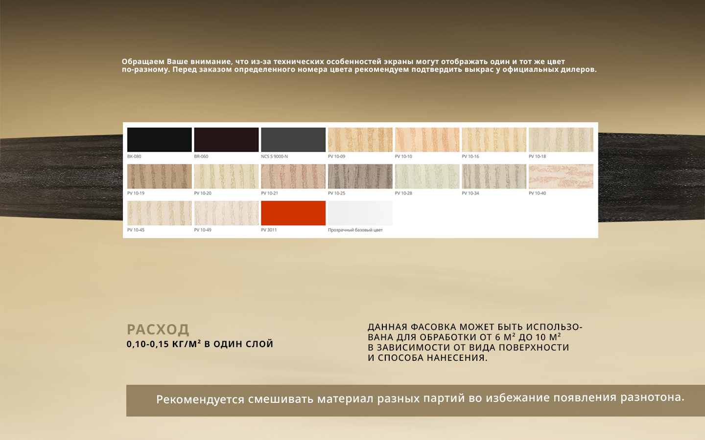 Применяется в качестве финишного декоративного покрытия для создания эффекта плавных цветовых переходов и придания особой выразительности фактурным покрытиям внутри и снаружи помещений.