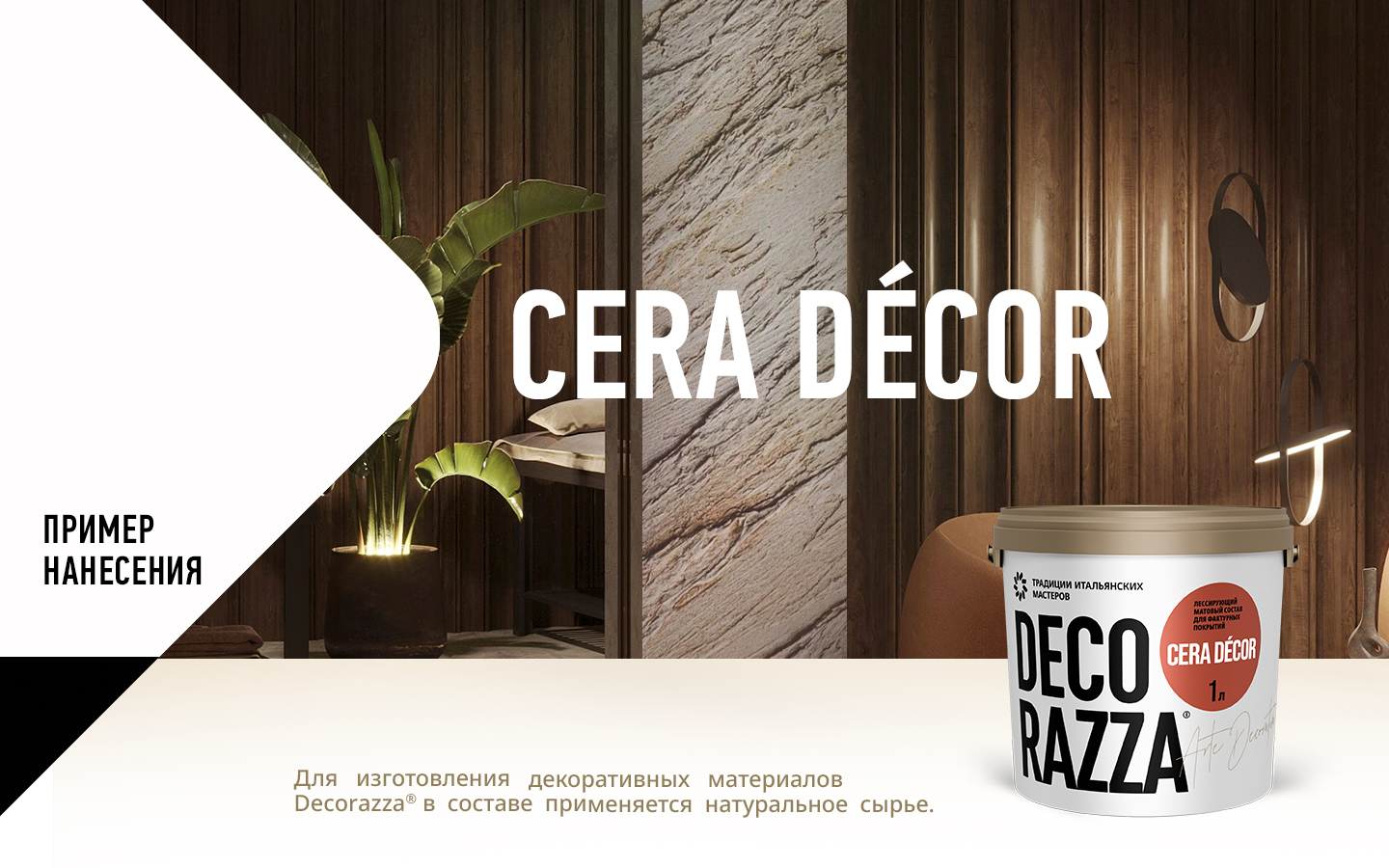 на основе воска позволяет придать особую выразительность декоративным штукатуркам под дерево, натуральный мрамор, металл, ткань и продуктам с имитацией других материалов. Лессировка используется для улучшения эстетических и эксплуатационных характеристик декоративных материалов. Продукт производится прозрачным, но может колероваться в разные оттенки по каталогу, усиливая или слегка приглушая за счет матовости яркость цвета основного покрытия. После обработки защитным составом Cera Decor поверхность становится устойчивее к влаге, истиранию, а загрязнения можно удалять влажной салфеткой без риска повреждения покрытия. Среди популярных эффектов, создаваемых с использованием этого материала, декоры «Кора», «Прованс», «Шале», «Травертин» и другие.