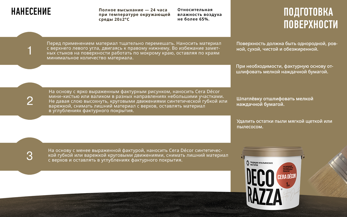Поверхность должна быть прочной, чистой, сухой и обезжиренной. При необходимости, фактурную основу отшлифовать мелкой наждачной бумагой. Удалить остатки пыли мягкой щеткой или пылесосом.