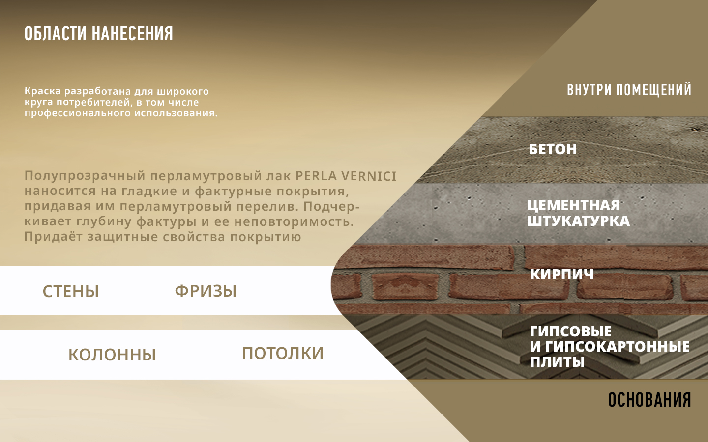 Применяется для создания декоративного покрытия без швов и соединений на стенах, потолках, колоннах, фризах и других архитектурных деталях внутри помещений. Полупрозрачный перламутровый лак Perla Vernici наносится на гладкие и фактурные покрытия, придавая им перламутровый перелив. Подчеркивает глубину фактуры и ее неповторимость. Придаёт защитные свойства покрытию.